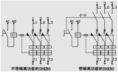 DHKBO結構采用倒裝式設計,接觸組觸頭及滅弧系統(tǒng)在安裝面底部,操作機構及電磁傳動機構在觸頭及滅弧系統(tǒng)的上部。觸頭的分合通過電磁傳統(tǒng)機構的銜鐵的吸合、斷開來實現(xiàn)。操作機構可通過就地或遠程控制電磁傳動機構的線圈通斷來控制產(chǎn)品接觸組的主觸頭通斷。